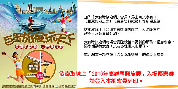 2010年高雄國際觀光旅展將於3月5日~3月8日在高雄巨蛋體育館登場,屆時將會有來自國內外百家廠商參展,歡迎民眾到現場拿好康、搶優惠。